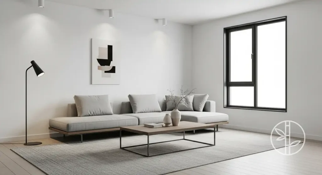 - پالت رنگی خنثی: رنگهای غالب شامل سفید، مشکی، خاکستری، بژ و قهوهای هستند. البته میتوان از رنگهای زنده و قوی به عنوان نقاط کانونی استفاده کرد.